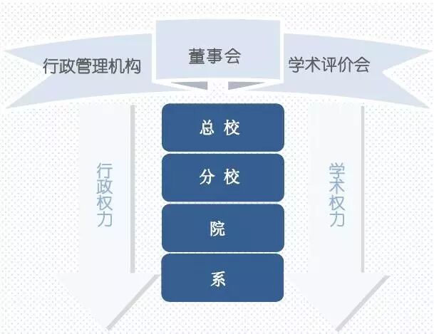 加州大学董事会建立在整个加州大学系统之上,是大学的最高权力机构,避免了外部力量对大学正常运行的干扰。分校不设董事会,表现出“集中决策”的特点。以校长为代表的行政机构掌握行政管理权,学术评议会执行学术管理权,这两类机构把这种权力贯穿到总校、分校、院、系等各个层次中,相互制约、相互作用,形成了双轨的“权力、责任”体系。在这个体系中,从纵向看,总校层次管理“全局”,在分校及更低层次“分权”;从横向看,很多工作是交织在一起的,由此实现资源的有效整合。一般来说,教授善于规划学术问题,而管理人员则善于组织和预算。但由于大学的因地而分,使得两类机构在横向上按照地域再度划分,形成了较大的事业部——分校,从而使两种权力在横向上的合作被分权给各自在分校层次上的机构,是另一个角度的“分权管理”。